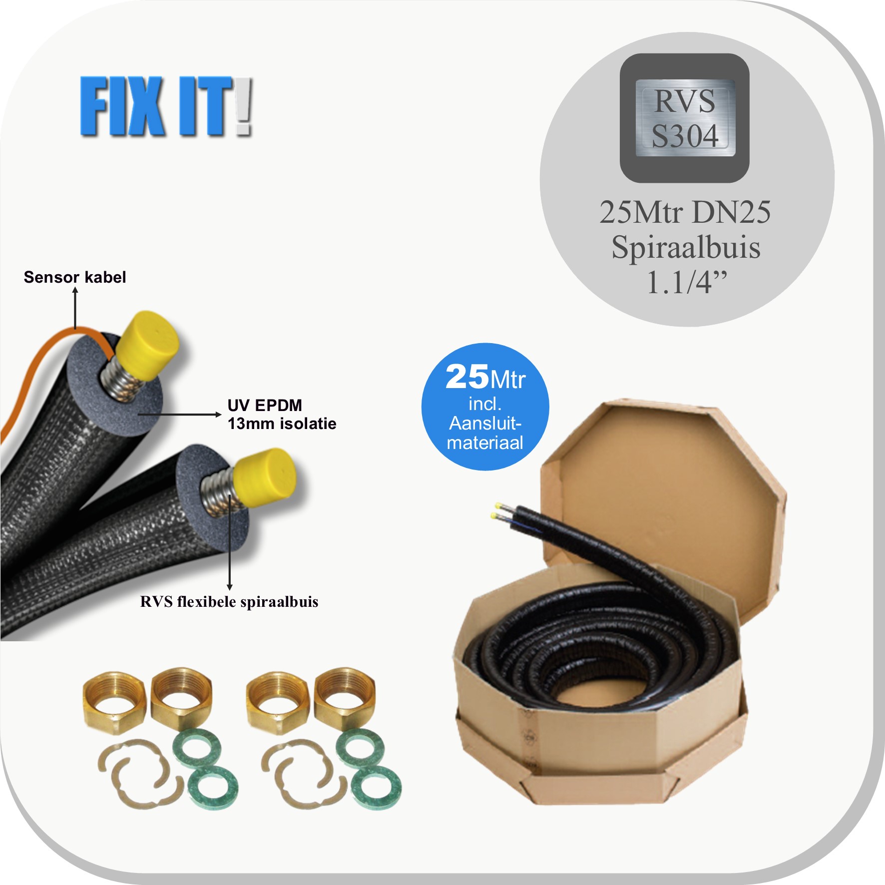 De Fix-It™ EPDM voorgeisoleerde roestvrije spiraalbuizen zijn speciaal ontwikkelt voor het gebruik in thermische zonsystemen. Door de hoge temperatuur en UV bestendigheid zijn deze RVS spiraalbuizen ideaal geschikt om in de open lucht te monteren zonder extra beschermingsmaatregelen. De dubbele spiraalbuizen worden geleverd inclusief 4 aansluitingen IS, vlakdichtend, isolatie en sensorkabel: