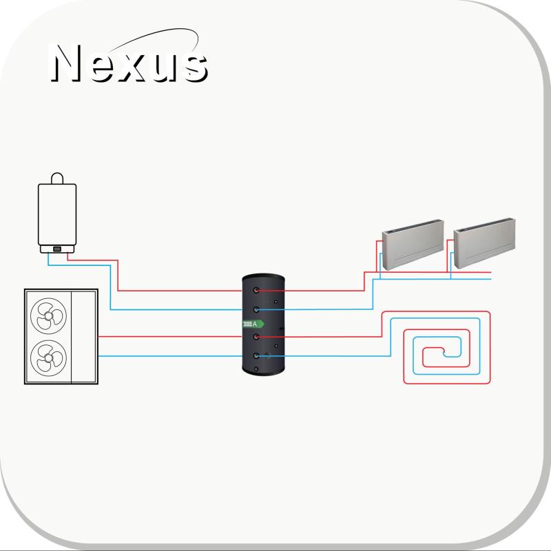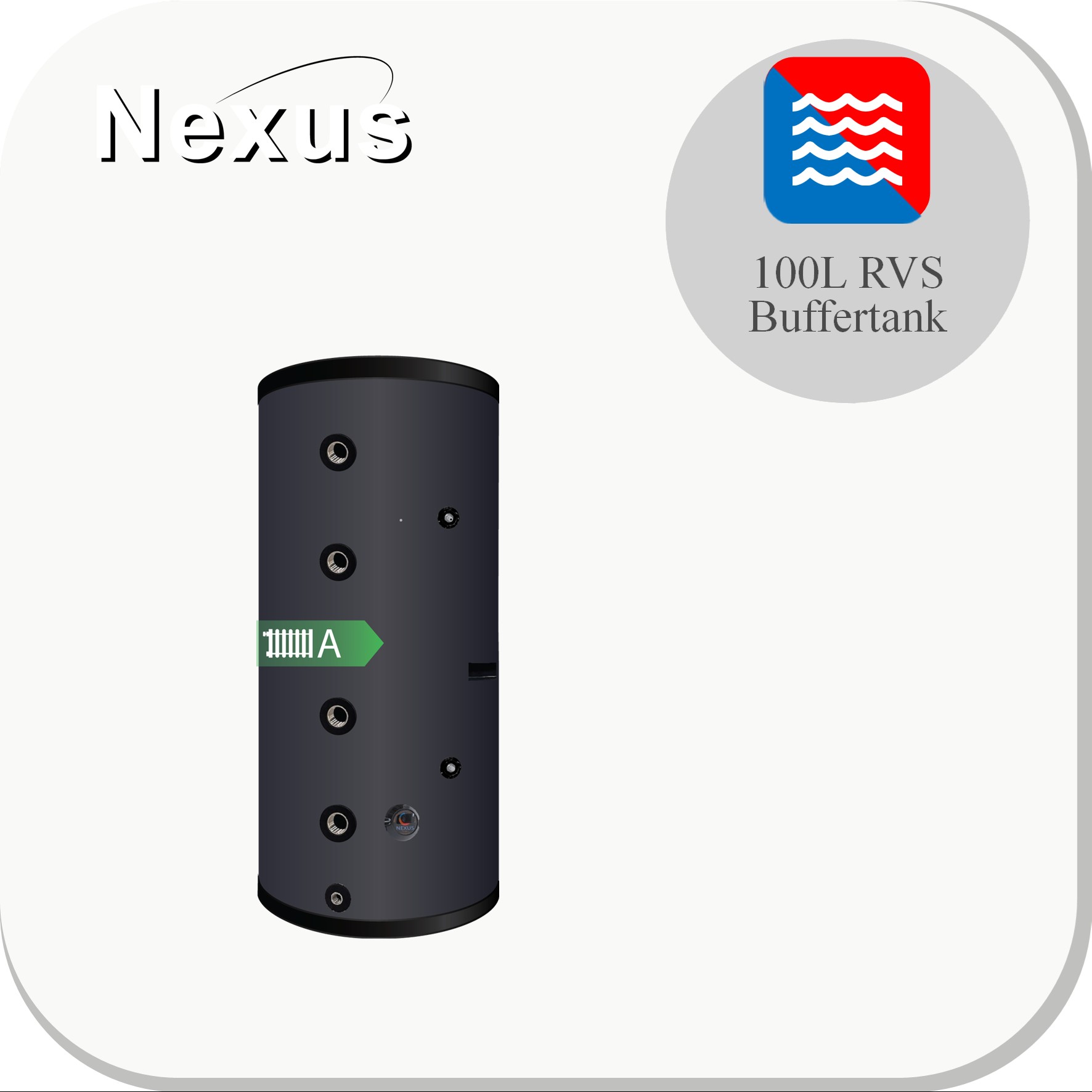 Een staande 100L buffervat met 8 zij-aansluitingen. Geschikt voor de integratie van een gasketel als back-up warmtebron voor warmtepompsystemen en voor de directe voeding van twee verwarmingscircuits, zoals ventilatorconvectors en vloerverwarming.