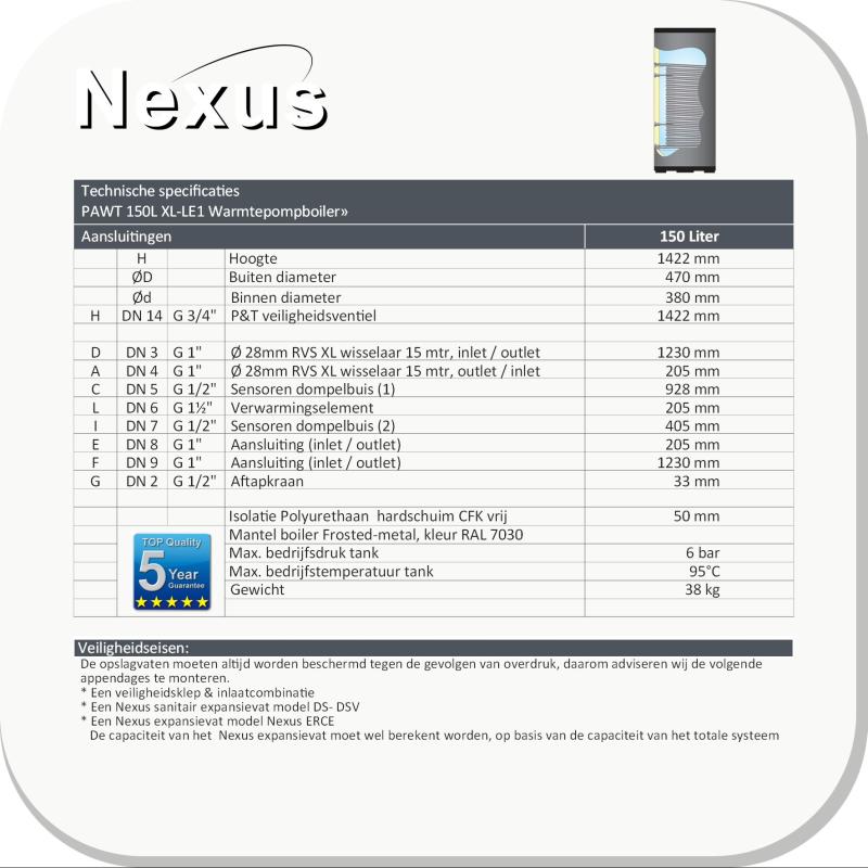 PAWT-150 XL-LE1 Solar-boiler met hoog rendement XL RVS warmtewisselaar.