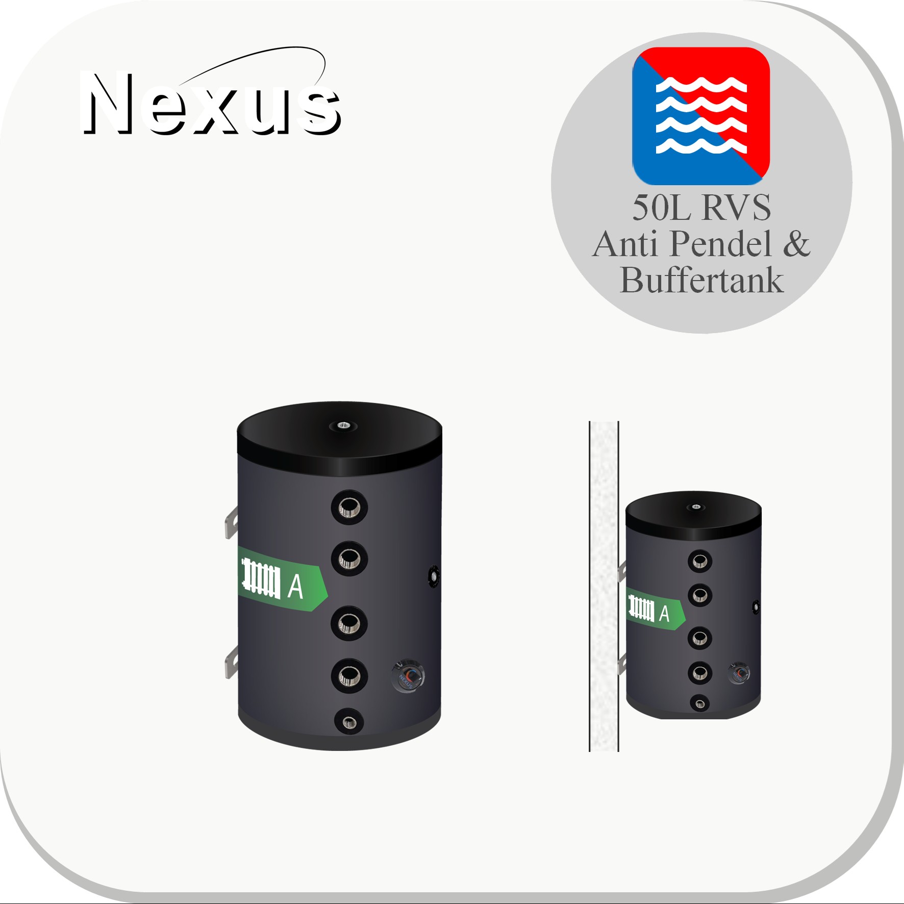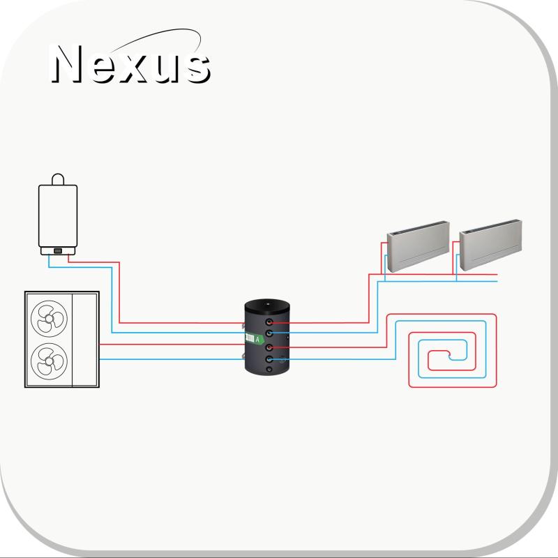 Een wandgemonteerd 50L buffervat met 8 zij-aansluitingen. Geschikt voor de integratie van een gasketel als back-up warmtebron voor warmtepompsystemen en voor de directe voeding van twee verwarmingscircuits, zoals ventilatorconvectors en vloerverwarming.