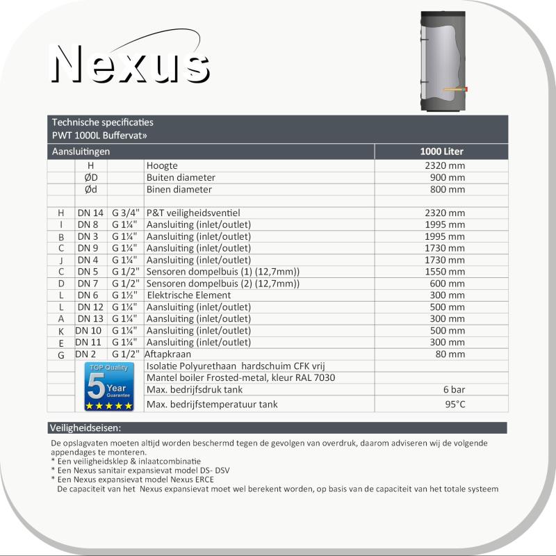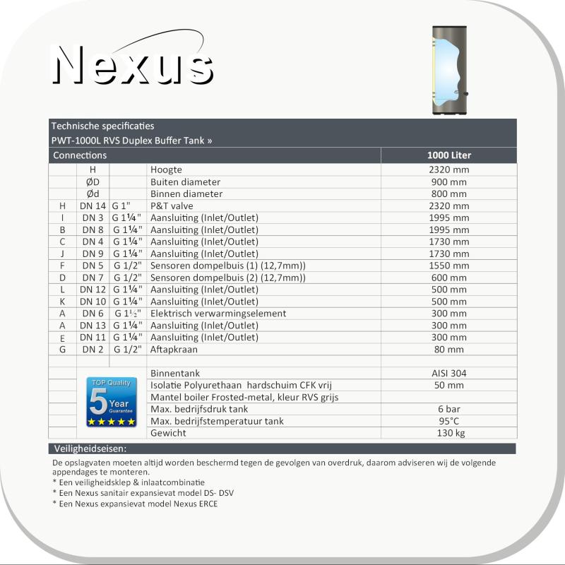 De NEXUS buffertanks van roestvrij staal voldoen aan de productiecontrole volgens de Europese richtlijn 2014/68/EU (module A). Met de de geavanceerde lastechniek beschikken de buffers over een internationaal hoog, duurzaam kwaliteitsniveau en een zeer elegante uitstraling en uitmuntende weerstand tegen corrosie.